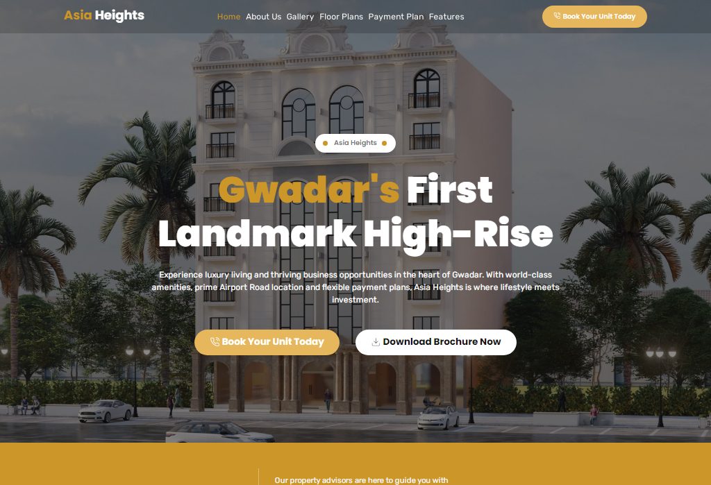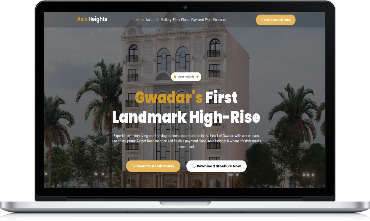 Asia Heights, Gwadar’s premier high-rise landmark, needed a website to highlight its luxury apartments, attract investors, and present a modern, professional brand image. Challenges included limited digital visibility and the need to communicate the building’s premium identity online.