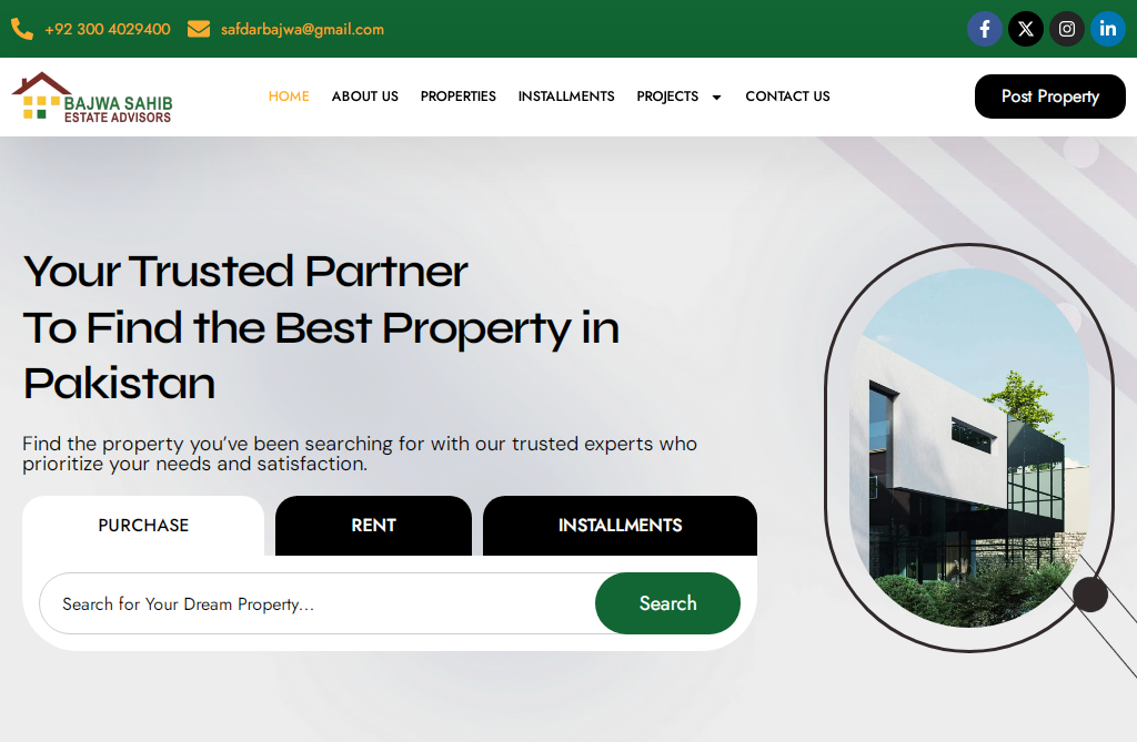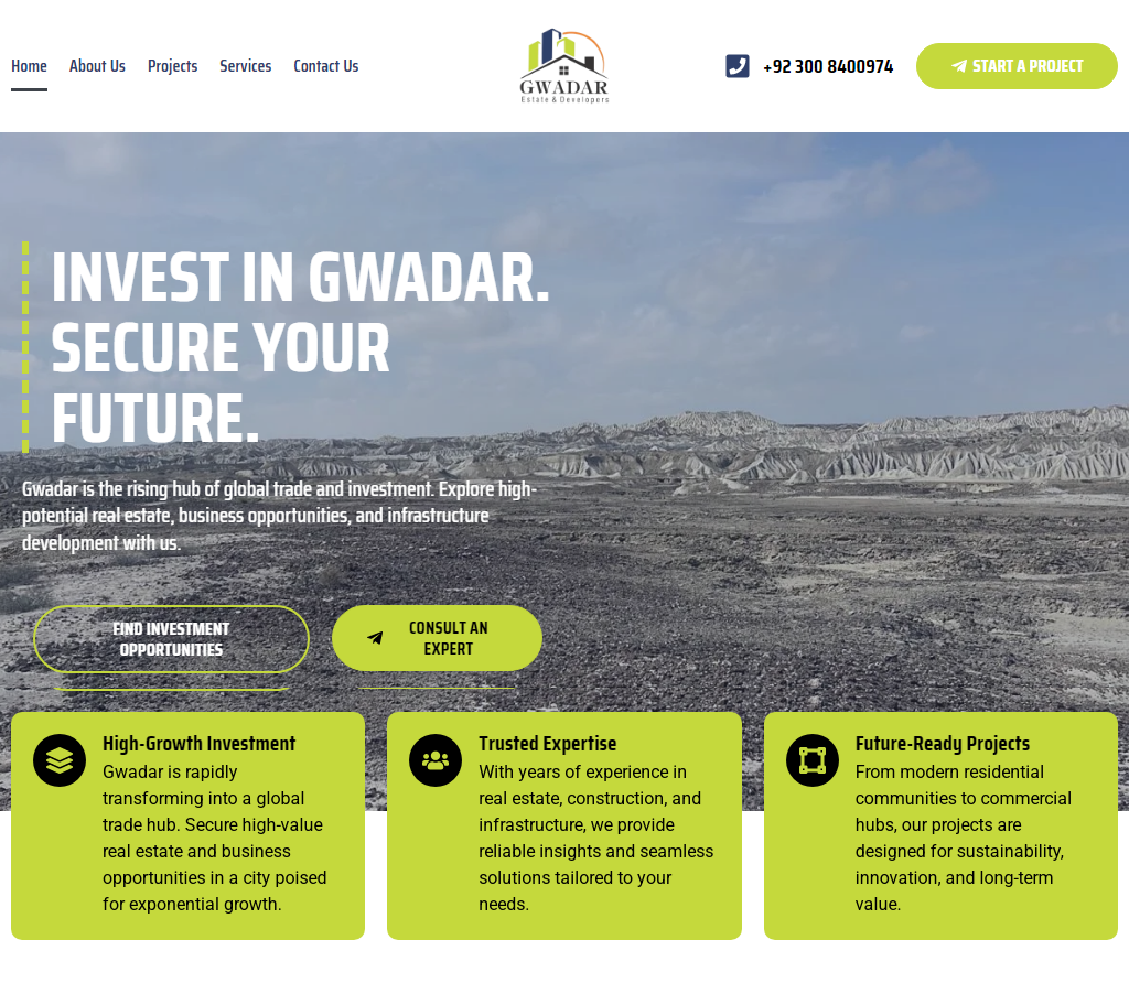 Gwadar Online, a company offering comprehensive property services, needed a website to present its expertise, attract clients, and establish a professional digital presence. Challenges included limited online visibility and difficulty showcasing services and projects effectively.