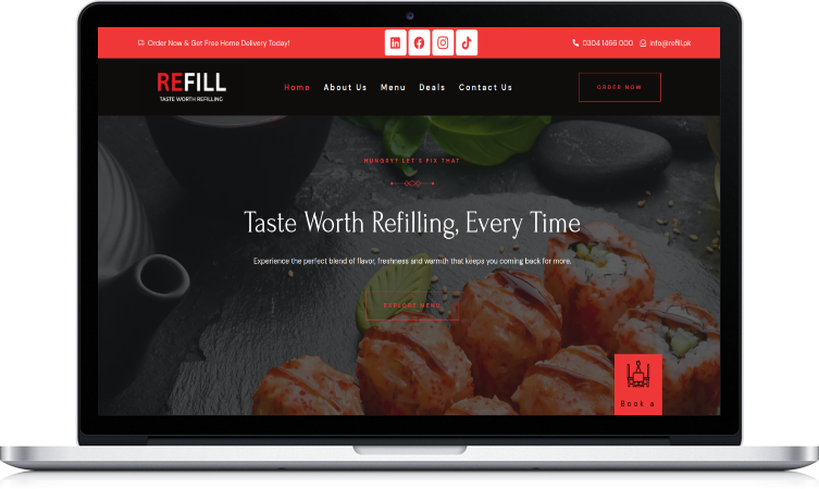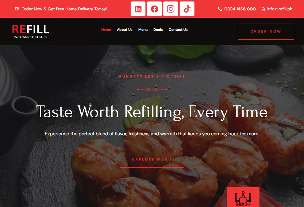 REFILL, a new fast-food restaurant, needed a website to attract customers, showcase its menu, and simplify online ordering. As a new brand, they faced challenges such as limited digital presence and difficulty communicating their vibrant identity.
